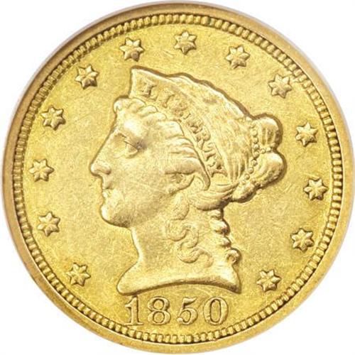 <B>1850-C $2 1/2 AU55 NGC.</B></I> Variety 12-G with the mintmark nestled between the left (facing) claw and feather. The obverse is sharply struck, although the eagle is incompletely brought up, as usual for this challenging Charlotte issue. A loupe locates a few faint thin marks. A mere 9,148 pieces were struck.<BR><BR><B>Coin Engraver:</B> Christian Gobrecht<BR><BR><b>Shipping:</b> Coins & Currency (<a target="_blank" href="http://www.heritageauctions.com/common/shipping.php">view shipping information</a>)
