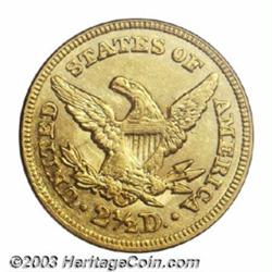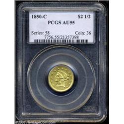 <table><tr><td><TABLE cellSpacing=0 cellPadding=0 width="100%" bgColor=#000000 border=0><TBODY> <TR><TD width="100%"><TABLE cellSpacing=1 cellPadding=3 width="100%" border=0><TBODY><TR><TD width="100%" bgColor=#79735c><FONT face=arial color=#ffffff size=3><B>Description</B> </FONT></TD></TR><TR><TD width="100%" bgColor=#ffffff><FONT face=arial size=2><B>1850-C $2 1/2 AU55 PCGS.</B></I> Winter 12-G. A bright yellow-gold example with a somewhat inconsistent strike, as is expected of the issue, and slightly reflective luster. Reeding marks on Liberty's chin and a trio in the right obverse field are useful for attribution. The '50-C Quarter Eagle is only a median rarity among C-mints despite its limited mintage, but is legitimately scarce in grades approaching Mint State.<BR><I>From The New Millennium Collection.</B></I> </FONT></TD></TR></TBODY></TABLE></TD></TR></TBODY></TABLE><BR><A name=PricesRealized></A><TABLE cellSpacing=0 cellPadding=0 width="100%" bgColor=#000000 border=0><TBODY><TR><TD width="100%"><TABLE cellSpacing=1 cellPadding=3 width="100%" border=0><TBODY><TR><TD width="100%" bgColor=#79735c><A name=PR><FONT face=arial color=#ffffff size=3><B>Previous Prices from Heritage Auctions</B> </FONT></A></TD></TR><TR><TD bgColor=#f6f6ed><TABLE cellSpacing=0 cellPadding=0 width="100%" border=1><TBODY><TR><TD align=middle width="33%"><B>Date</B></TD><TD align=middle width="33%"><B>Service</B></TD><TD align=middle width="33%"><B>Price</B></TD></TR><TR bgColor=whitesmoke><TD width="33%"><B>02/12/1999</B></TD><TD width="33%">PCGS</TD><TD width="33%">$8,050.00</TD></TR><TR bgColor=whitesmoke><TD width="33%"><B>01/01/1994</B></TD><TD width="33%">PCGS</TD><TD width="33%">$3,630.00</TD></TR><TR bgColor=whitesmoke><TD width="33%"><B>05/01/2001</B></TD><TD width="33%">NGC</TD><TD width="33%">$4,140.00</TD></TR></TBODY></TABLE></TD></TR><TR><TD bgColor=#ffffff><FONT face=arial size=1 ?>PLEASE NOTE: All prices realized reflect the final hammer price PLUS the buyer's premium in auctions that charge a buyer's premium. Each item has a notation at the top of the listing indicating whether that lot included a buyer's premium. Example: A item that sells with a final hammer price of $100 and a 20% buyer's premium will display with a price realized of $120. All information listed is intended to be as accurate as possible, but errors are possible. Please use this guide carefully and inform us of any inaccuracies. </FONT></TD></TR></TBODY></TABLE></TD></TR></TBODY></TABLE><BR><TABLE cellSpacing=0 cellPadding=0 width="100%" bgColor=#000000 border=0><TBODY><TR><TD width="100%"><TABLE cellSpacing=1 cellPadding=3 width="100%" border=0><TBODY><TR><TD width="100%" bgColor=#79735c colSpan=6><FONT face=arial color=#ffffff size=3><B>Price Guide*</B> </FONT></TD></TR><TR bgColor=#f6f6ed><TD align=middle><B>Grade</B> </TD><TD align=middle><B>Coin World<BR>(Trends)</B> </TD><TD align=middle><B>Numismedia<BR>Retail</B> </TD><TD align=middle><B>Numismedia<BR>Wholesale</B> </TD><TD align=middle><B>Coin<BR>Universe</B> </TD><TD align=middle><B>Heritage<BR>Value Index</B> </TD></TR><TR bgColor=#ffffff><TD align=middle>53</TD><TD align=right>---</TD><TD align=right>---</TD><TD align=right>$2,925.00</TD><TD align=right>---</TD><TD align=right>$4,176.39</TD></TR><TR style="FONT-WEIGHT: bold" bgColor=#cccfdd><TD align=middle>55</TD><TD align=right>$7,500.00</TD><TD align=right>---</TD><TD align=right>$4,575.00</TD><TD align=right>$4,875.00</TD><TD align=right>$5,302.50</TD></TR><TR bgColor=#ffffff><TD align=middle>58</TD><TD align=right>$12,000.00</TD><TD align=right>---</TD><TD align=right>$7,150.00</TD><TD align=right>---</TD><TD align=right>$8,962.00</TD></TR><TR bgColor=#ffffff><TD colSpan=6><FONT size=1>*All information listed is intended to be as accurate as possible, but errors are possible. No item may be returned or refused based on this information which is provided as a service to our customers. You should contact each pricing source directly to determine the accuracy of this information. </FONT></TD></TR></TBODY></TABLE></TD></TR></TBODY></TABLE><BR><TABLE cellSpacing=0 cellPadding=0 width="100%" bgColor=#000000 border=0><TBODY><TR><TD width="100%"><TABLE cellSpacing=1 cellPadding=3 width="100%" border=0><TBODY><TR><TD width="100%" bgColor=#79735c><FONT face=arial color=#ffffff size=3><B>Population Guide</B> </FONT></TD></TR><TR bgColor=#ffffff><TD align=middle><!-- Begin Output of Population Grid--><TABLE cellSpacing=0 cellPadding=0 width="100%" border=0><TBODY><TR><TD vAlign=center><TABLE cellSpacing=0 width="100%" border=1 cellsadding="3"><TBODY><TR><TD vAlign=center><TABLE cellSpacing=0 cellPadding=3 width="100%" border=1><TBODY><TR><TD vAlign=center align=middle bgColor=#f0f1e8 colSpan=2 <CENTER><FONT face=Arial size=2><B>PCGS Pop </B></FONT><CENTER></CENTER></TD><TD vAlign=center align=middle bgColor=#f0f1e8 colSpan=2><CENTER><FONT face=Arial size=2><B>NGC Pop</B></CENTER></FONT></TD></TR><TR><TD vAlign=center><FONT face=Arial size=2>(55)</FONT> </TD><TD vAlign=center align=right><FONT face=Arial size=2>12</FONT> </TD><TD vAlign=center><FONT face=Arial size=2>(55)</FONT> </TD><TD vAlign=center align=right><FONT face=Arial size=2>13</FONT> </TD></TR><TR><TD vAlign=center><FONT face=Arial size=2>(>55)</FONT> </TD><TD vAlign=center align=right><FONT face=Arial size=2>6</FONT> </TD><TD vAlign=center><FONT face=Arial size=2>(>55)</FONT> </TD><TD vAlign=center align=right><FONT face=Arial size=2>26</FONT> </TD></TR></TBODY></TABLE></TD></TR></TBODY></TABLE></TD></TR></TBODY></TABLE><!-- End Output of Population Grid--></TD></TR></TBODY></TABLE></TD></TR></TBODY></TABLE><BR><TABLE cellSpacing=0 cellPadding=0 width="100%" bgColor=#000000 border=0><TBODY><TR> Important notice: Heritage usually auctions material at the rate of 200-250 lots per hour. On some occasions eBay Live bid software or the Internet may not be able to keep up with the pace of the auction. We recommend placing a realistic absentee bid now as insur