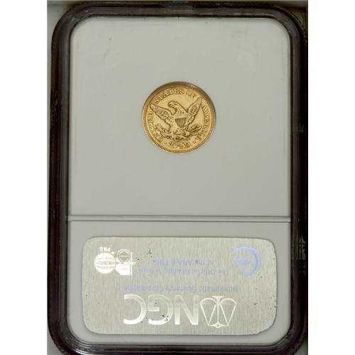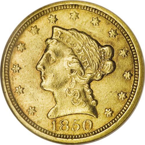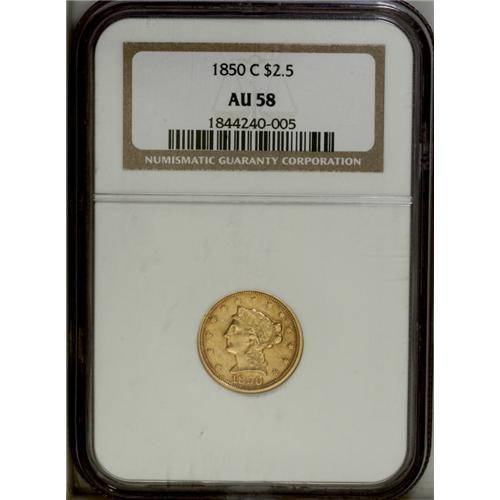 <B>1850-C $2 1/2 AU58 NGC.</B></I> Variety 12-G. Flashes of prooflike luster benefit peripheral areas of this rare date quarter eagle. A scant 9,148 pieces were struck, and those were about evenly divided into two mintmark location varieties. Variety 12-G has the mintmark centered above the numerator, while 12-H centers the mintmark over the fraction bar. This light golden-brown piece has some striking softness on the eagle's leg, and a thin mark is noted near star 7. Census: 17 in 58, 19 finer (10/06).<BR><BR><b>Shipping:</b> Coin/Currency (<a target="_blank" href="http://www.heritageauctions.com/common/shipping.php">view shipping information</a>)