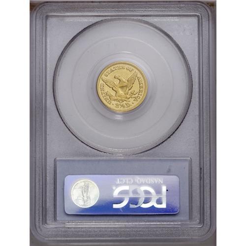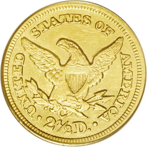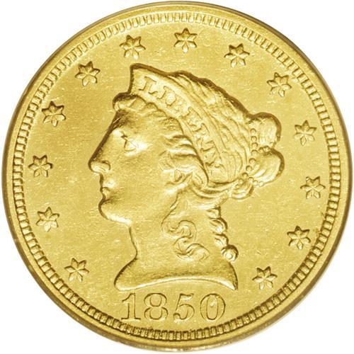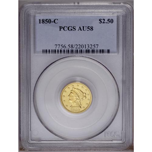 <B>1850-C<$2 1/2> AU58 PCGS.</B></I> Variety 12-G. Two different reverse dies were used for the coinage of 1850-C quarter eagles, and they are easily distinguished by a quick glance. The mintmark is centered over the digit 1 in the fraction on this variety with reverse G. The other reverse has the mintmark centered over the top of the fraction bar. By a small margin, variety 12-G is slightly more common. This is a sharply struck representative of the variety with brilliant greenish-yellow gold surfaces and prooflike fields. Minor abrasions are visible on both sides, and these are consistent with the grade.