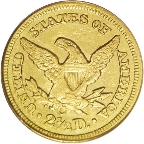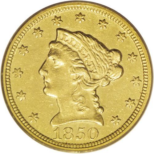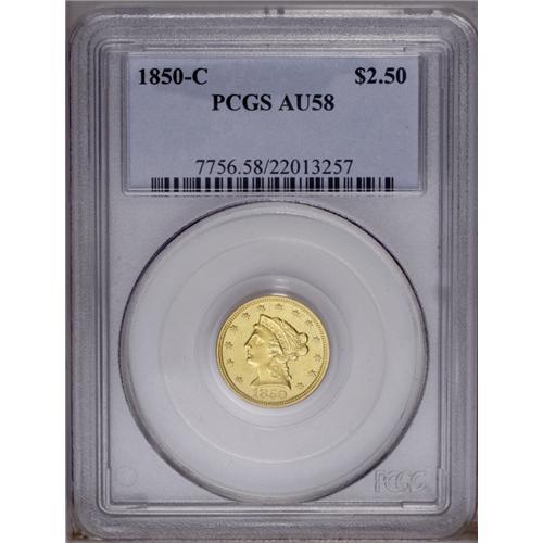 <B>1850-C $2 1/2 AU58 PCGS.</B></I> Variety 12-G. Two different reverse dies were used for the coinage of 1850-C quarter eagles, and they are easily distinguished by a quick glance. The mintmark is centered over the digit 1 in the fraction on this variety with reverse G. The other reverse has the mintmark centered over the top of the fraction bar. By a small margin, variety 12-G is slightly more common. This is a sharply struck representative of the variety with brilliant greenish-yellow gold surfaces and prooflike fields. Minor abrasions are visible on both sides, and these are consistent with the grade.<BR><BR><b>Shipping:</b> Coin/Currency (<a target="_blank" href="http://www.heritageauctions.com/common/shipping.php">view shipping information</a>)