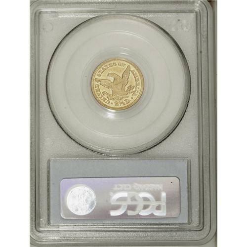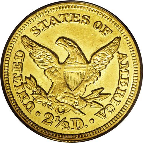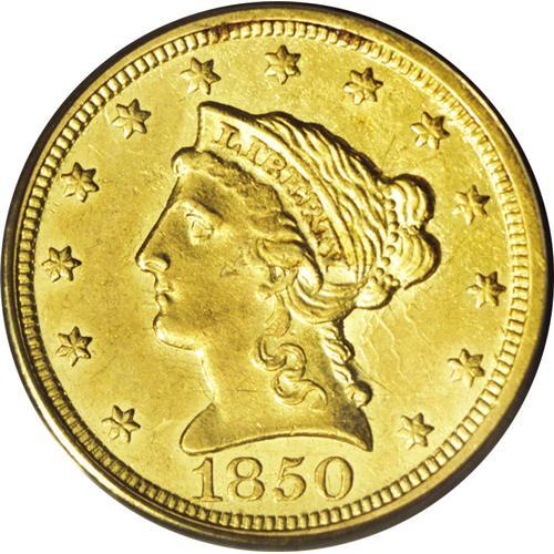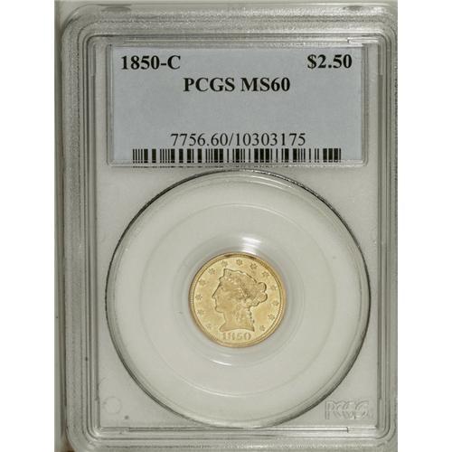 <B>1850-C<$2 1/2> MS60 PCGS.</B></I> Variety 12-G. An exquisite example of this desirable Southern gold issue. At least five sets of clash marks are prominent in the fields, and are characteristic of the comparatively primitive facilities at Charlotte. Nonetheless, the strike is sharp, aside from moderate softness on the shield lines. There is no indication of wear on the hair above the ear, unlike nearly all survivors of this difficult low mintage date. The luminous honey-gold surfaces are refreshingly unmarked for the MS60 level, although a couple of drops of lacquer are noted on the TY in LIBERTY, the hair over the ear, the cheekbone, and the field beneath star 8. This lacquer can be removed harmlessly upon proper conservation. Only 9,148 pieces were struck. Population: 1 in 60, 3 finer (8/06).<BR><I>From The Della Collection.</B></I>