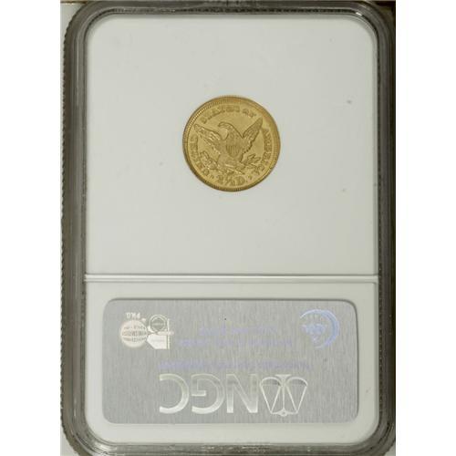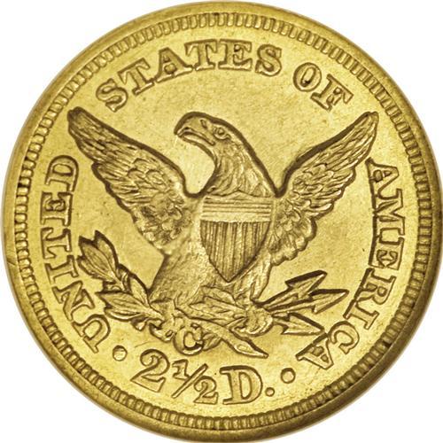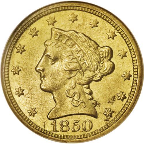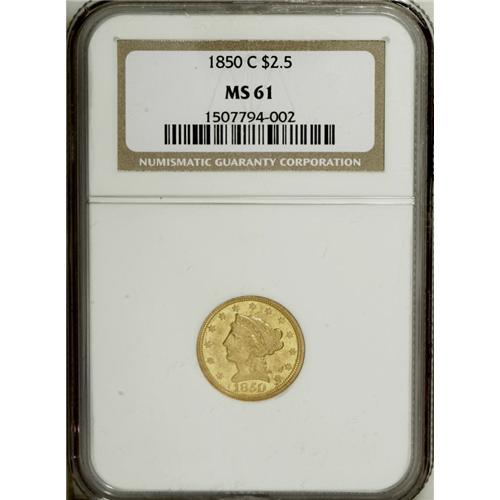 <B>1850-C $2 1/2 MS61 NGC.</B></I> Variety 12-G. A more available Charlotte quarter eagle that becomes exceedingly scarce in Mint State. In this grade there are few measurably better, with just four pieces currently graded finer by the two major services. Well struck on both sides. The only noticeable weakness is on some of the obverse stars, and on the eagle's left (facing) leg, talons, and arrow fletchings. Lustrous with pleasing lime-gold toning, substantial semi-prooflikeness in the fields, and marks on each side that are numerous but mainly small and superficial, leaving the luster essentially undisturbed. Only 9,148 quarter eagles of this date were struck at the Charlotte Mint. Census: 13 in 61, 3 finer (11/06).<BR><BR><b>Shipping:</b> Coin/Currency (<a target="_blank" href="http://www.heritageauctions.com/common/shipping.php">view shipping information</a>)
