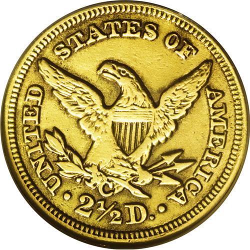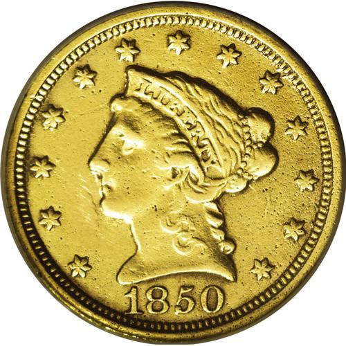 <B>1850-C<$2 1/2>--Repaired, Improperly Cleaned--NCS. AU Details.</B></I> Variety 12-G. The noted repair is visible in the obverse field to the left of Liberty's mouth and chin, perhaps an ill-advised attempt to hide a planchet flaw. The color is a uniform and unnatural dull gold deepening to olive in the recessed areas of the reverse. Despite the problems, the details are essentially intact. Indeed, although this coin, like so many of the date, suffers from an incomplete strike most notable on the eagle's left (facing) leg and the hair above Liberty's eye, it appears as if very little detail has been lost to actual wear.