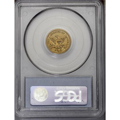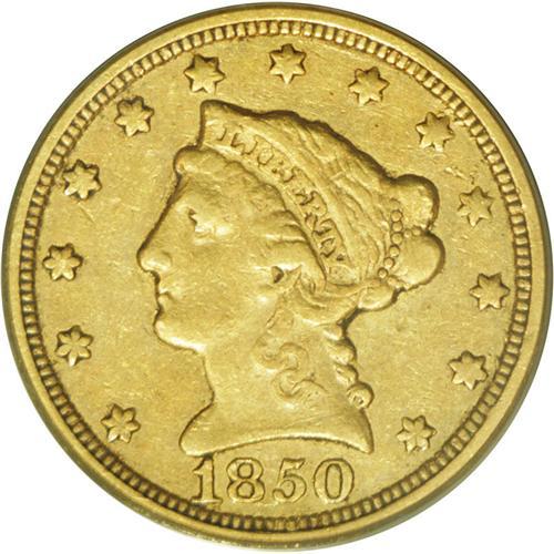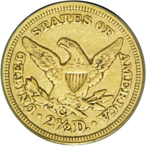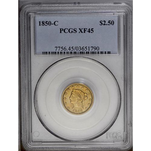 <B>1850-C $2 1/2 XF45 PCGS.</B></I> Variety 12-G. On this variety, the 1 in the date is very close to the denticles, while the 0 is closer to the denticles than to the bust, while the C mintmark is flush against the talons and arrow feathers. Most of the 100 or so estimated survivors are in VF grades, and XF and better pieces are rare. The present Choice XF example displays deep golden-green toning. Relatively sharp detail is noted on the design elements, better than what might be expected for an issue with an inherently poor strike. We do note, however, that the leg feathers are weak. While the typical example is difficult to locate without very heavily abraded surfaces, this specimen reveals just a few minute obverse marks. The gold specialist will want to give serious attention to this lot.<BR><I>From The Carolina Gold Collection, Part Two.</B></I>