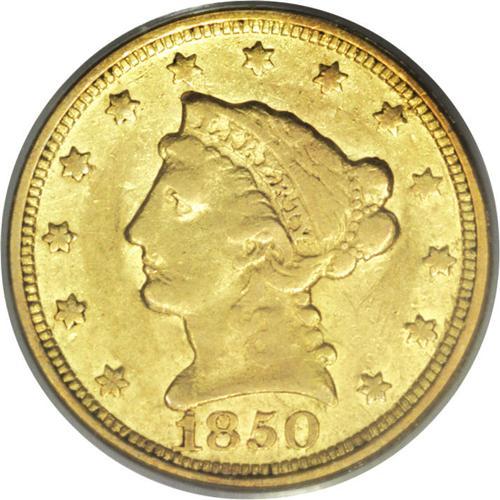 <B>1850-C<$2 1/2> XF45 PCGS.</B></I> Variety 12-G. Only 9,148 coins of this date were struck at Charlotte, although it is actually seen with slightly greater frequency than some of the higher mintage C-mint issues. The surfaces are a pale green color and only a couple of minor pinscratches are noted on the reverse. <BR><BR><B>Important not