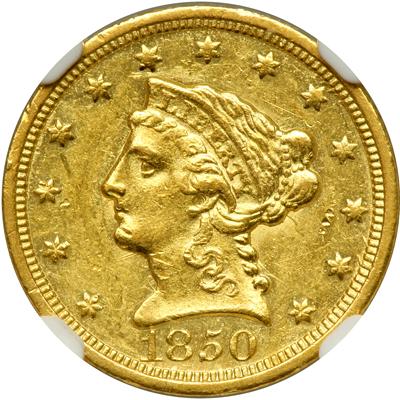 1850-C $2.50 Liberty. NGC graded MS-61. Only 9,148 minted. It is known that the 1850-C is generally regarded as the second most common C-mint quarter eagle from the 1850s. But that only makes it one of the most readily affordable. Furthermore, the issues becomes increasingly scarce in the higher grades with precious few Mint States known. The peripheral details on this handsome coin are much sharper than average, which makes it an example that is strongly struck. Some of the interior devices show characteristic softness, noticeable at the eagle's feathers and talons, but it is important not to overlook the fact that the reverse die used here was only activated for a portion of the '50-C production and was its first and only usage. There is a small mark at Liberty's chin; another, like a chattermark, behind the hair bun, and a minor flake or void on the throat (as struck). A slight green-gold patina covers the very lightly abraded surface luster for an acceptably lustrous MS grade. Pop 14; 2 in 62; 1 in 63. In a new NGC 4 pronged holder (PCGS # 7756).