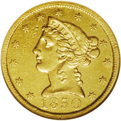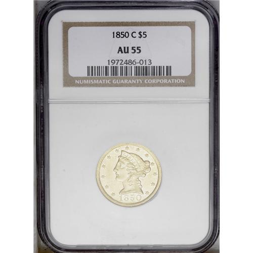 <B>1850-C<$5> AU55 NGC.</B></I> Variety 15-G, State I. Bold C mintmark. Well defined from what could more accurately be described as a median die state, with considerable evidence of prooflike luster in the protected areas. A few small abrasions are clustered between Liberty's brow and star 5. While among the more heavily produced half eagle issues from the Charlotte facility, many survivors are either more heavily circulated or are made less desirable by an especially weak mintmark. <BR><BR><B>Important notice:</B> Heritage usually auctions material at the rate of 200-250 lots per hour. On some occasions eBay Live bid software or the Internet may not be able to keep up with the pace of the auction. We recommend placing a realistic absentee bid now as insurance to avoid disappointment. Occasionally the auctioneer may eliminate or reject an eBay Live bid, and the auctioneer may also reopen a lot after the close of the eBay live bidding (usually because we missed an audience bid), and may reject your bid even if it shows you as the winning bidder. By bidding via eBay Live, you agree that Heritage may award the lot to another bidder at its sole discretion under the circumstances described above or any other reasonable circumstances. Since eBay bids are not shown to us until we open the lot on the floor, we treat those bids just like floor bids. In most cases the floor responds before the eBay bid is presented to us, due to Internet lag time, so for consistency we have made it a policy that floor bids are always considered first over tie eBay live bids. Also please note that all Heritage lots purchased through eBay Live carry a 20% Buyer's Premium. Please make sure you read the Terms and Conditions before you bid. This lot is being auctioned in conjunction with a live floor auction by Heritage Galleries & Auctioneers. All final auction and invoice information will be supplied by Heritage Galleries & Auctioneers, and all other information should be considered preliminary. Lot:2701 <BR><BR><B>Winning Notification and Billing:</B> After the FINAL session in this auction is complete, Heritage will send e-mail and snail mail invoices. This process normally takes several days. All final auction and invoice information will be supplied by Heritage Galleries & Auctioneers, and all other information should be considered preliminary. <BR><BR>This auction will be conducted on a live auction floor and over the Internet through eBay Live. If you choose to place an absentee bid, please take a moment to <font color='#0000ff'><u><a href='http://pages.ebay.com/liveauctions/help/before/laabsentee.html'>learn how eBay Live absentee bidding works</a></u></font><font color='#000000'>