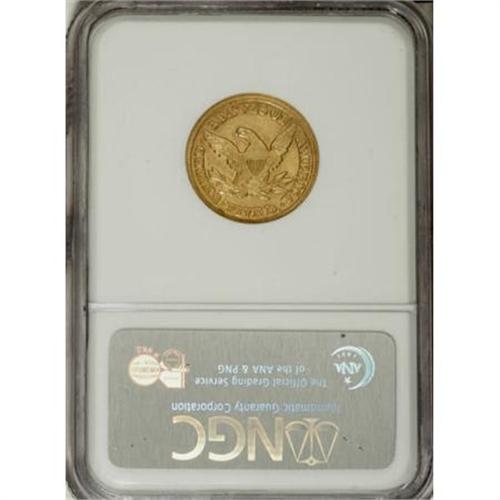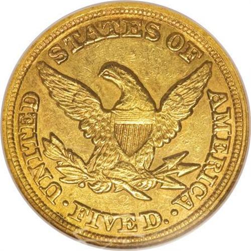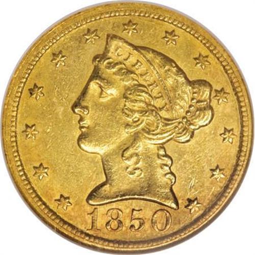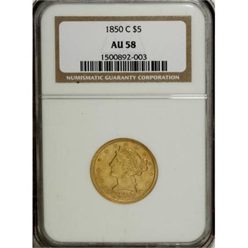 <B>1850-C $5 AU58 NGC.</B></I> Variety 15-G, State II. The mintmark is faint but fully outlined. Bold luster radiates from the straw-gold surfaces. The strike is suitable, with only slight weakness on the arrow feathers. Close scrutiny with a loupe reveals few abrasions, and no mentionable distractions.<BR><BR><B>Coin Engraver:</B> Christian Gobrecht<BR><BR><b>Shipping:</b> Coins & Currency (<a target="_blank" href="http://www.heritageauctions.com/common/shipping.php">view shipping information</a>\)
