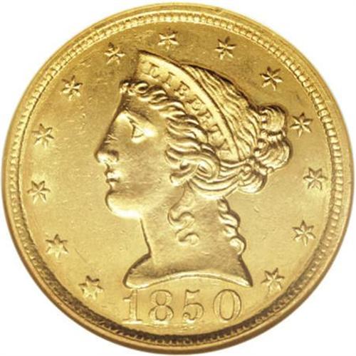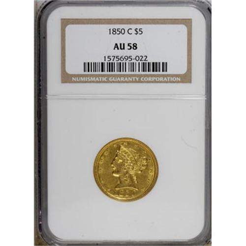 <B>1850-C $5 AU58 NGC.</B></I> Variety 15-F. An early die state with only faint die cracks near the FI in FIVE. This area eventually develops a prominent retained die break. This clean example is well struck save for minor incompleteness on the eagle's neck feathers. Liberty's cheek is a bit glossy, and faint marks are noted above the eagle's head.<BR><BR><B>Coin Engraver:</B> Christian Gobrecht<BR><BR><b>Shipping:</b> Coins & Currency (<a target="_blank" href="http://www.heritageauctions.com/common/shipping.php">view shipping information</a>)