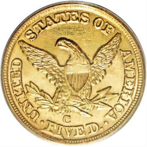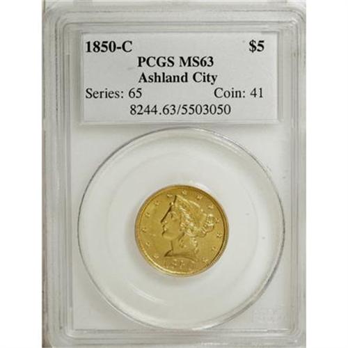 <B>1850-C $5 MS63 PCGS.</B></I> Ex: Ashland City. Variety 15-F. The rarest variety of the year, the 15-F shows a rim-to-rim die break on the lower reverse, that on this coin is an actual cud. This is probably the second finest known example of this popular issue, being exceeded only in grade by the MS64 from the Milas Collection. The devices are fully struck throughout and the mintmark is completely brought up. The surfaces are bright green-gold with a light overlay of orange patina. Each side shows a few small field marks but none are large enough to warrant individual mention. An outstanding, high grade Charlotte half eagle.<BR><I>Ex: Ashland City Collection of Branch Mint Gold Coins (Heritage, 1/03), lot 4773.</B></I><BR><I> </B></I><BR><I>From The Waxhaw Collection.</B></I><BR><BR><B>Coin Engraver:</B> Christian Gobrecht<BR><BR><b>Shipping:</b> Coins & Currency (<a target="_blank" href="http://www.heritageauctions.com/common/shipping.php">view shipping information</a>)