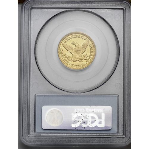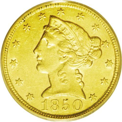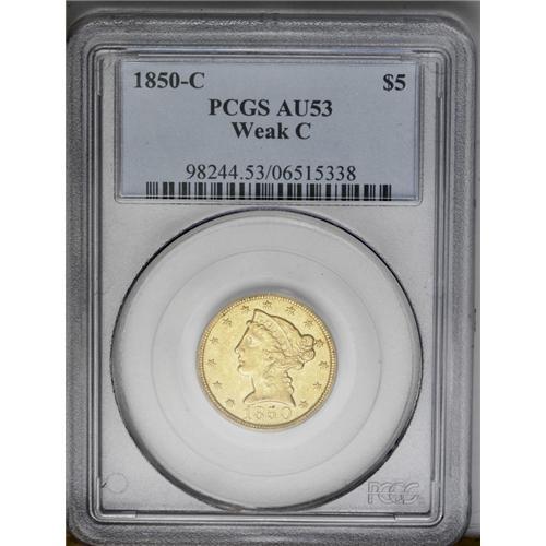 <B>1850-C<$5> Weak C AU53 PCGS.</B></I> Variety 15-G. A partly lustrous straw-gold Charlotte half eagle with normal striking deficiency in the centers. Although faint, the entire outline of the mintmark can easily be identified. A roundish dig is noticed near the reverse border following the D in UNITED.