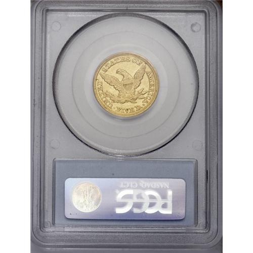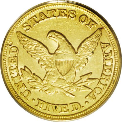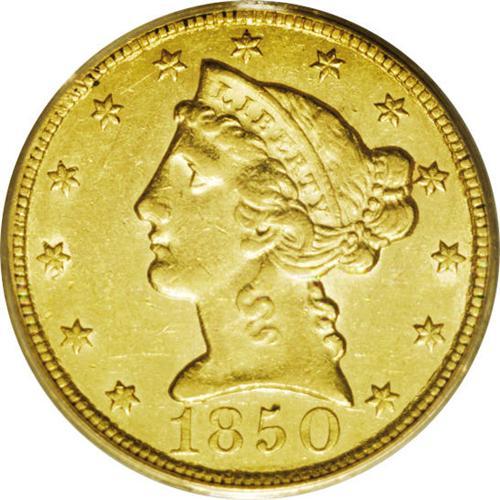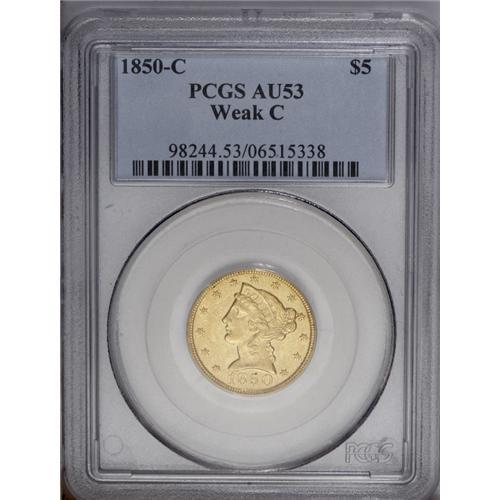 <B>1850-C $5 Weak C AU53 PCGS.</B></I> Variety 15-G. Lustrous yellow-gold with normal striking deficiency in the centers. Although faint, the entire outline of the mintmark can easily be identified. A roundish dig is noticed near the reverse border following the D in UNITED.