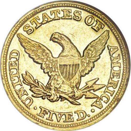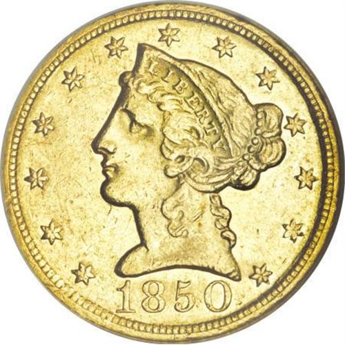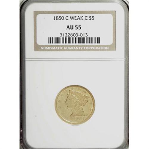 <B>1850-C $5 Weak C AU55 NGC.</B></I> Variety 15-G, Die State II. The mintmark is in low relief, but its full curve is apparent with the aid of a loupe. This yellow-gold Charlotte gold piece has noticeable luster throughout the borders and within the devices.<BR><I>Ex: George N. Polis, M.D. Collection (Bowers and Merena, 6/91), lot 2332.</B></I><BR><I>From The John Stimson, Sr. Collection, Part Two.</B></I><BR><BR><b>Shipping:</b> Coins & Currency (<a target="_blank" href="http://www.heritageauctions.com/common/shipping.php">view shipping information</a>)