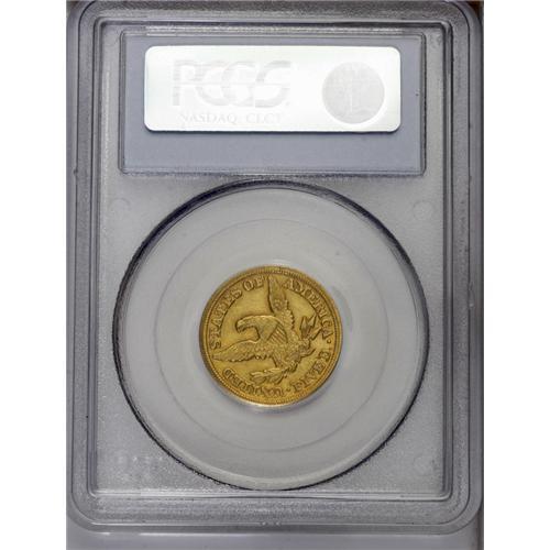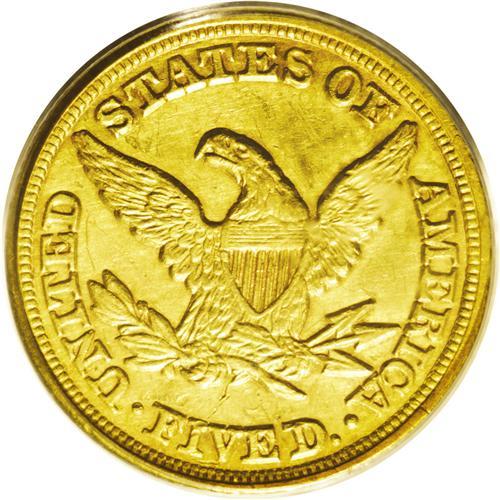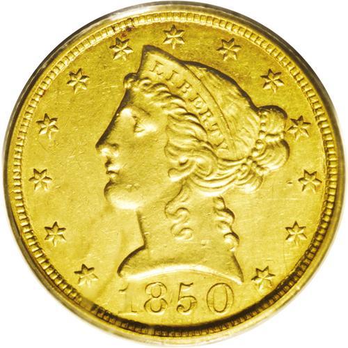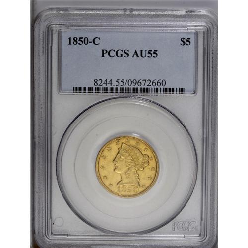 <B>1850-C<$5> Weak C AU55 PCGS.</B></I> A lightly worn example of Carolina gold with much of the original luster intact. The devices display great detail for this issue, though slight weakness appears on the eagle's wings. The reverse is rotated approximately 60 degrees counterclockwise; this issue is rare with rotated dies. Population: 19 in 55, 21 finer (7/06).