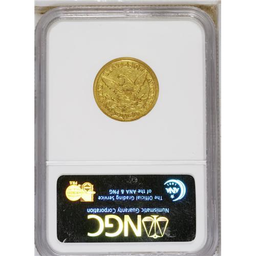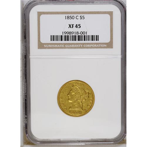 <B>1850-C $5 XF45 NGC.</B></I> Variety 15-F. The rarest variety of the year, the 15-F shows a rim-to-rim die break on the lower reverse, that on this coin is an actual cud. Yellow-gold surfaces display traces of light green, and the devices retain nice detail. A few expected marks are scattered about each side.<BR><BR><b>Shipping:</b> Coin/Currency (<a target="_blank" href="http://www.heritageauctions.com/common/shipping.php">view shipping information</a>)
