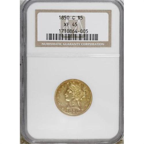 <B>1850-C $5 Weak C XF45 NGC.</B></I> Variety 15-G, Die State II by Winter's nomenclature, although both the obverse and reverse die differ from those used in his Variety 15-G, Die State I (a bold C marriage with a high date and mintmark). Moderate marks are present on the cheek and on the reverse field near the mintmark, beak, and arrows.<BR><BR><B>Coin Engraver:</B> Christian Gobrecht<BR><BR><b>Shipping:</b> Coins & Currency (<a target="_blank" href="http://www.heritageauctions.com/common/shipping.php">view shipping information</a>)