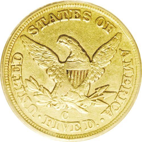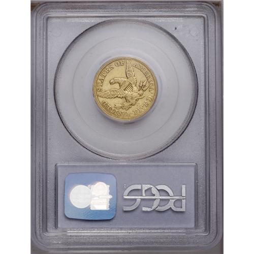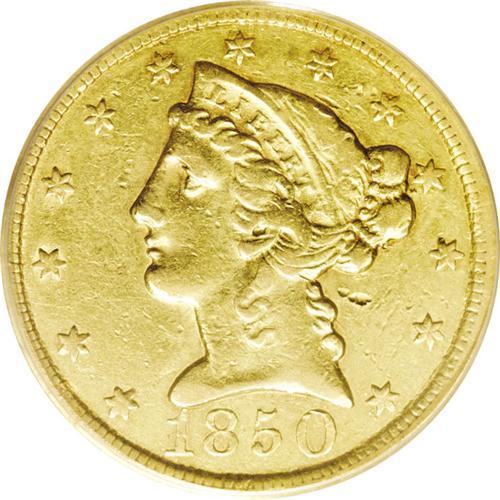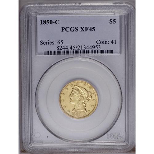 <B>1850-C<$5> XF45 PCGS.</B></I> Variety 14-F. This variety is easily spotted by the radial die crack that runs alongside the left serif of the U in UNITED. The present honey-gold specimen is weakly struck through the eagle's lower legs, claws, and fletchings, as frequently seen, but pleasingly impressed elsewhere. The light abrasions noted throughout are grade-consistent.