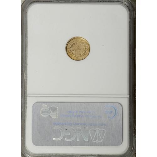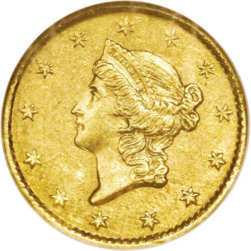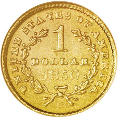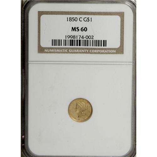 <B>1850-C G$1 MS60 NGC.</B></I> Variety 3-C. The usual dies for this difficult low mintage Charlotte issue. This boldly impressed green-gold and lemon piece is subdued but unabraded. Minute strike-throughs beneath the portrait are mint-made and of little consequence. A worthy Mint State example.<BR><BR><b>Shipping:</b> Coin/Currency (<a target="_blank" href="http://www.heritageauctions.com/common/shipping.php">view shipping information</a>)