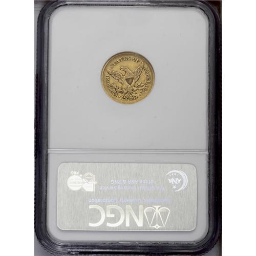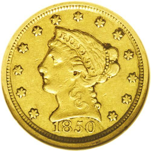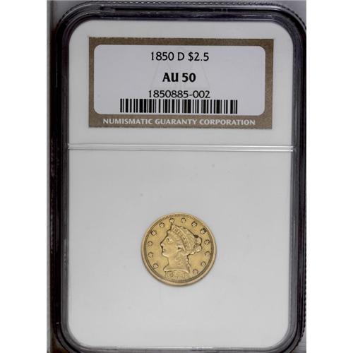 <B>1850-D<$2 1/2> AU50 NGC.</B></I> Variety 13-M. The warm sunset-orange surfaces of this Dahlonega quarter eagle show light wear and some handling marks consistent with brief circulation. Fragments of luster appear in protected areas, and the strike is solid for this issue. A small dark patch appears above Liberty's hair. Census: 5 in 50, 93 finer (7/06).