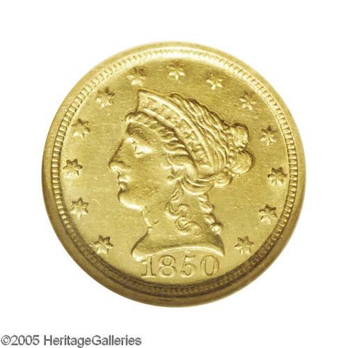 <B>1850-D<$2 1/2> AU55 NGC.</B></I> Variety 13-M. A boldly struck example with uncommonly crisp detail on the eagle's neck and Liberty's curls for a Dahlonega product. Only the right (facing) claw is not sharp. The lightly toned fields are surprisingly unabraded, although a couple of inconspicuous marks are noted on the left side of Liberty's neck. Luster dominates both borders. A scant production of 12,148 pieces ensures a paucity of problem-free survivors.