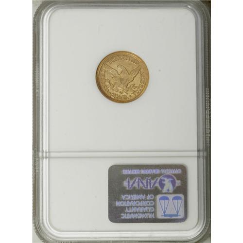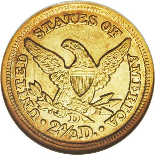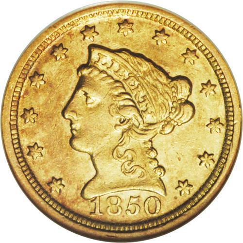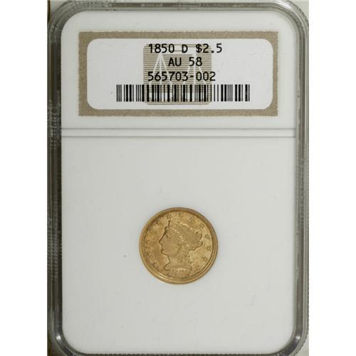 <B>1850-D $2 1/2 AU58 NGC.</B></I> Variety 13-M. Numerous resubmissions skew the population data for many issues of Dahlonega gold, and the 1850-D quarter eagle is no exception. This near-Mint representative has hardly as much company as the combined NGC and PCGS populations would suggest; that fifty examples exist in AU58 is implausible at best. The detail is above-average, and the orange-gold fields display a measure of reflectivity. Light friction affects the devices, and abrasions appear on the neck and elsewhere, but the overall eye appeal is far stronger than that of most other pieces.<BR><BR><b>Shipping:</b> Coin/Currency (<a target="_blank" href="http://www.heritageauctions.com/common/shipping.php">view shipping information</a>)