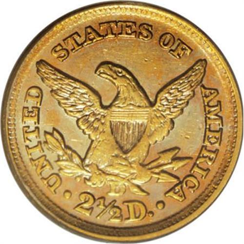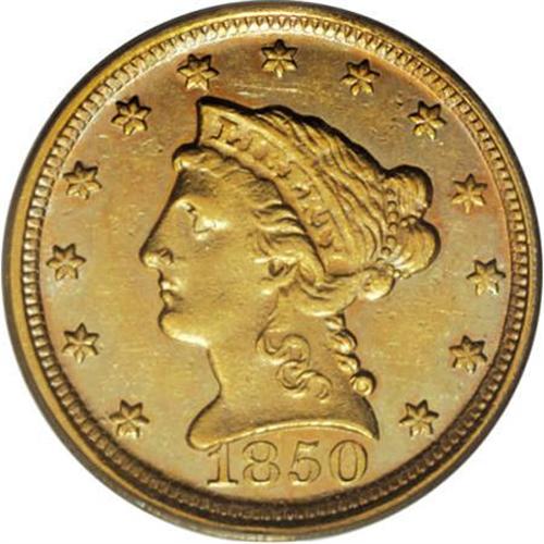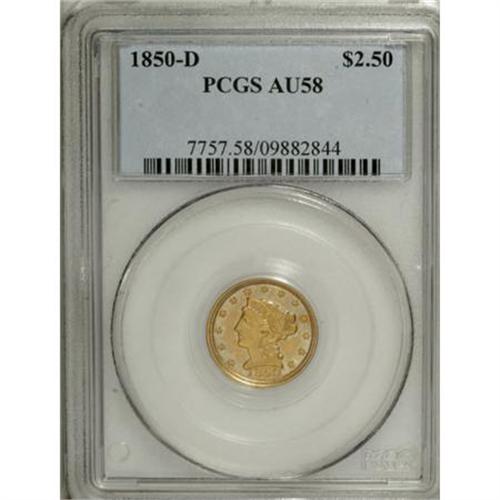 <B>1850-D $2 1/2 AU58 PCGS.</B></I> Variety 13-M. The only known die variety. The 1850-D quarter eagle, with a mintage of 12,148 pieces, is a scarce issue; Mint State coins are rare. This high-end AU displays variegated apricot-gold and mint-green color. Nicely defined, except for weakness on the eagle's legs. The fields are mildly prooflike and only lightly abraded. Population: 13 in 58, 6 finer (6/07).<BR><BR><B>Coin Engraver:</B> Christian Gobrecht<BR><BR><b>Shipping:</b> Coins & Currency (<a target="_blank" href="http://www.heritageauctions.com/common/shipping.php">view shipping information</a>\)