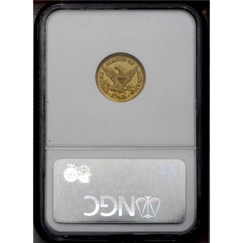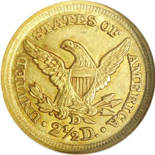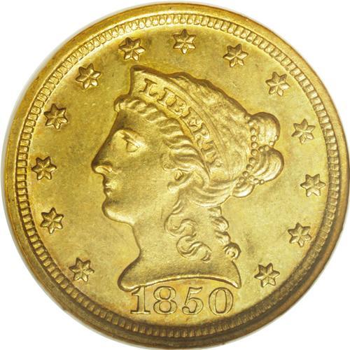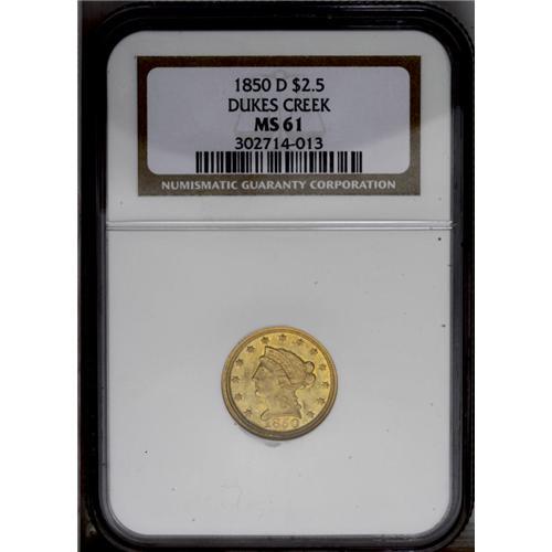 <B>1850-D<$2 1/2> MS61 NGC.</B></I> Variety 13-M. The only known die variety of this year. Struck from lightly clashed dies, with a few clash marks over the eagle's right shoulder.<BR> The obverse shows a nice amount of detail, while the reverse has some minor weakness on the eagle's left leg and right claw. There are just a few small, well-scattered marks on the surfaces and a few hairlines that are not the result of cleaning. For the sake of future pedigree information, we feel compelled to mention a few small abrasions over the tip of the coronet on the obverse. Both sides are toned in medium green-gold shades, with some tinges of orange-gold on the high spots.<BR> There were 12,148 examples struck of the 1850-D, of which an estimated 125-150 are known today. This is the 12th scarcest of 20 Dahlonega quarter eagles in higher grades. Three to four dozen exist in AU, and another four to six are known in Uncirculated. The NGC population figure is extremely distorted as the result of a naughty coin dealer (you know who you are ...) resubmitting an example and then "forgetting" to turn in the old inserts. NGC currently shows 12 graded in MS61, but the actual number of distinct coins is probably more in the area of three or four pieces. The present example is clearly among the finest known, but it is not listed on the current Condition Census.<BR><I>From The Duke's Creek Collection of Dahlonega Gold.</B></I>