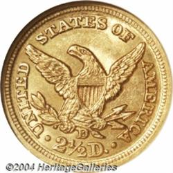 <table><tr><td><table><tr><td>1850-D $2 1/2 MS63 NGC. Variety 13-M. While the 1850-D is the most available Dahlonega Quarter Eagle from the 1850s despite a paltry original mintage of 12,148 pieces, Uncirculated examples are of the utmost rarity. Among the handful of coins certified as Mint State by the major services are a couple thought to be marginal Uncs by experts in the field. The extraordinary example offered here leaves no such doubts in the viewers mind. Its boldly struck surfaces are alive with rich frosty luster and tinges of coppery-orange patina are seen in the recesses. Only the presence of numerous wispy field marks tends to inhibit the grade. We feel relatively safe in labeling this remarkable 1850-D Quarter Eagle as the finest known since it exceeds any other example by two full points. Population: 1 in 63, 0 finer (4/04). <BR><BR><B>Important notice:</B> Heritage usually auctions material at the rate of 200-250 lots per hour. On some occasions eBay Live bid software or the Internet may not be able to keep up with the pace of the auction. We recommend placing a realistic absentee bid now as insurance to avoid disappointment. Occasionally the auctioneer may eliminate or reject an eBay Live bid, and the auctioneer may also reopen a lot after the close of the eBay live bidding (usually because we missed an audience bid), and may reject your bid even if it shows you as the winning bidder. By bidding via eBay Live, you agree that Heritage may award the lot to another bidder at its sole discretion under the circumstances described above or any other reasonable circumstances. Since eBay bids are not shown to us until we open the lot on the floor, we treat those bids just like floor bids. In most cases the floor responds before the eBay bid is presented to us, due to Internet lag time, so for consistency we have made it a policy that floor bids are always considered first over tie eBay live bids. Also please note that all Heritage lots purchased through eBay Live carry a 20% Buyer's Premium. Please make sure you read the Terms and Conditions before you bid. <BR><BR><B>IMPORTANT ANNOUNCEMENT ABOUT RESERVES:</B> Heritage now divulges all reserves on its web site 7 days before every auction. If you want to know whether the reserve on this lot has been met, and if not, what the reserve amount is, please visit this lot page on the HeritageCoin.com web site, or email: bid@HeritageGalleries.com </span></font></td></tr></table></td></tr></table>