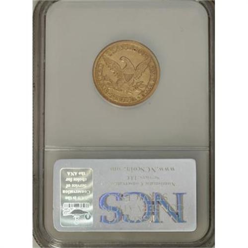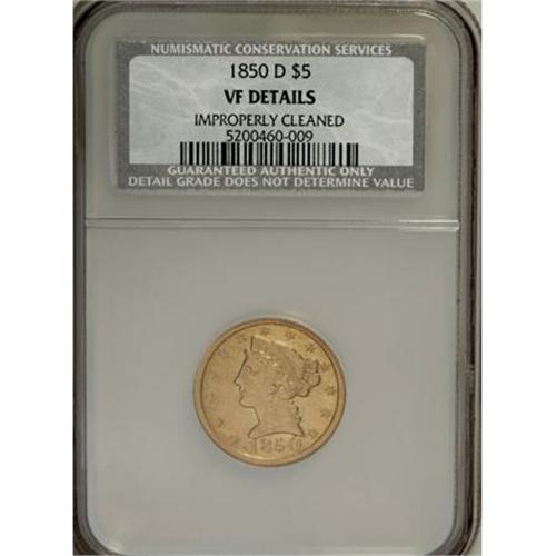<B>1850-D $5 --Improperly Cleaned--NCS. VF Details.</B></I> Variety 24-P. Both sides are thickly hairlined, but there are no other noticeable marks. Liberty's hair has a typical strike. The mintmark is lightly entered but fully present. The left reverse border has slender die cracks.<BR><BR><B>Coin Engraver:</B> Christian Gobrecht<BR><BR><b>Shipping:</b> Coins & Currency (<a target="_blank" href="http://www.heritageauctions.com/common/shipping.php">view shipping information</a>)