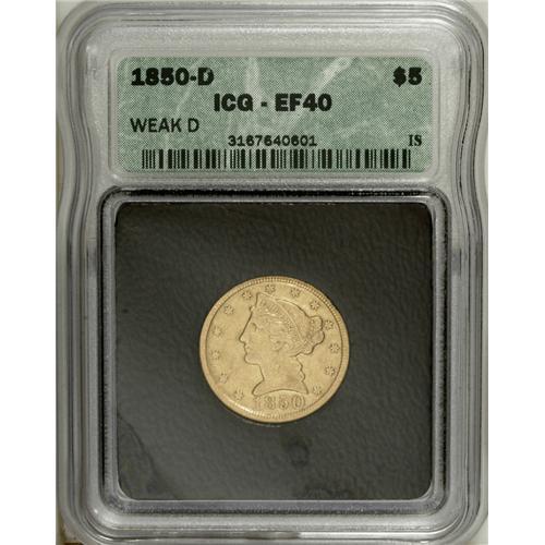 <B>1850-D $5 Weak D XF40 ICG.</B></I> Variety 24-P. A hint of original luster appears on the reverse of this lightly worn mustard-gold example. Well struck with a number of scattered handling marks. Surprisingly elusive, especially when one considers the nearly 44,000 examples coined.<BR><BR><b>Shipping:</b> Coin/Currency (<a target="_blank" href="http://www.heritageauctions.com/common/shipping.php">view shipping information</a>)