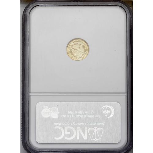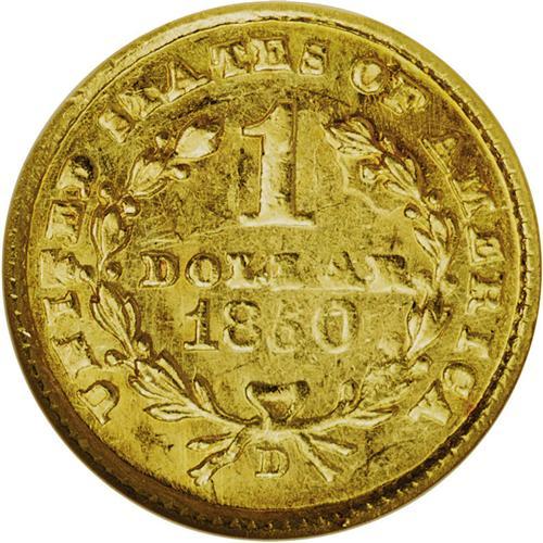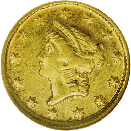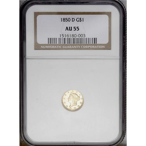 <B>1850-D<G$1> AU55 NGC.</B></I> Variety 2-C. Substantial bright luster suggests an even higher circulated grade, although the centers are typically impressed and light marks are noted near the chin and on the cheek. The initial Closed Wreath gold dollar Dahlonega issue. A stingy production of 8,382 pieces ensures that relatively few pieces are retained in high grades. Census: 10 in 55, 42 finer (2/06).