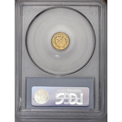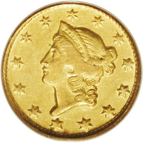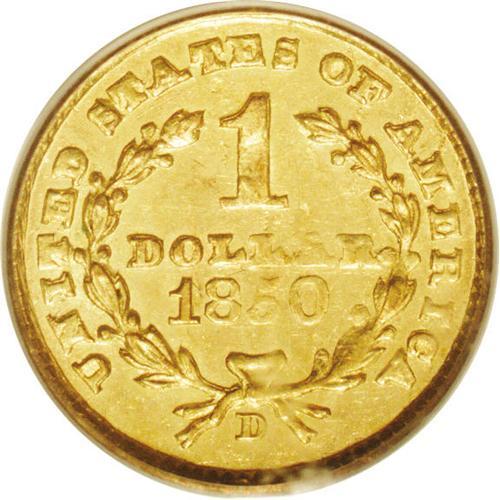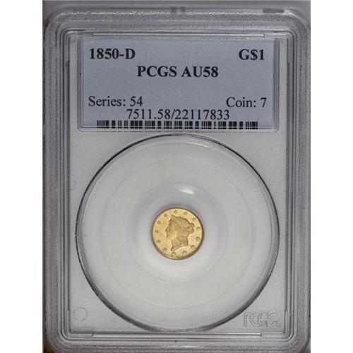 <B>1850-D G$1 AU58 PCGS.</B></I> Variety 2-C. Although weak central details are typical of the entire mintage, the surfaces and luster are certainly finer than most survivors. Considerable die crumbling is visible on the reverse, indicating the extensive use of a single die. In Philadelphia, a die that showed this much wear would have been replaced with a newly created die. The branch mints, especially in such a secluded location as Dahlonega, did not have the luxury of replacing a die at the first signs of wear, but had to use all of their equipment far beyond a reasonable limit. Lovely light yellow surfaces with splendid orange high-point toning.