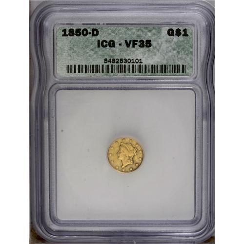 <B>1850-D<G$1> VF35 ICG.</B></I> Variety 2-C. A luminous canary-gold Dahlonega dollar with pleasing surfaces, although the portrait is bluntly struck near the ear. Just 8,382 pieces were struck.<BR><I>From The Steve Glenn Collection.</B></I> <BR><BR><B>Important notice:</B> Heritage usually auctions material at the rate of 200-250 lots per hour. On some occasions eBay Live bid software or the Internet may not be able to keep up with the pace of the auction. We recommend placing a realistic absentee bid now as insurance to avoid disappointment. Occasionally the auctioneer may eliminate or reject an eBay Live bid, and the auctioneer may also reopen a lot after the close of the eBay live bidding (usually because we missed an audience bid), and may reject your bid even if it shows you as the winning bidder. By bidding via eBay Live, you agree that Heritage may award the lot to another bidder at its sole discretion under the circumstances described above or any other reasonable circumstances. Since eBay bids are not shown to us until we open the lot on the floor, we treat those bids just like floor bids. In most cases the floor responds before the eBay bid is presented to us, due to Internet lag time, so for consistency we have made it a policy that floor bids are always considered first over tie eBay live bids. Also please note that all Heritage lots purchased through eBay Live carry a 20% Buyer's Premium. Please make sure you read the Terms and Conditions before you bid. This lot is being auctioned in conjunction with a live floor auction by Heritage Galleries & Auctioneers. All final auction and invoice information will be supplied by Heritage Galleries & Auctioneers, and all other information should be considered preliminary. Lot:2250 <BR><BR><B>Winning Notification and Billing:</B> After the FINAL session in this auction is complete, Heritage will send e-mail and snail mail invoices. This process normally takes several days. All final auction and invoice information will be supplied by Heritage Galleries & Auctioneers, and all other information should be considered preliminary. <BR><BR>This auction will be conducted on a live auction floor and over the Internet through eBay Live. If you choose to place an absentee bid, please take a moment to <font color='#0000ff'><u><a href='http://pages.ebay.com/liveauctions/help/before/laabsentee.html'>learn how eBay Live absentee bidding works</a></u></font><font color='#000000'>