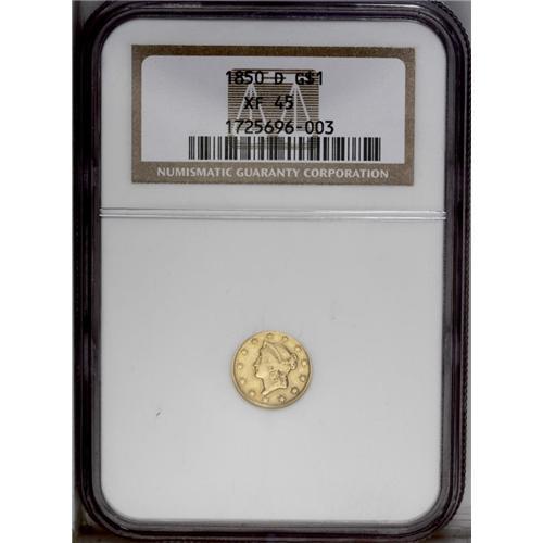<B>1850-D<G$1> XF45 NGC.</B></I> Variety 2-C. Luster glimmers from the design, and the surfaces are void of unpleasant marks. The strike is blunt, as usual for this rare issue. A scant 8,382 pieces were struck.<BR><I>From The Tide Collection.</B></I>