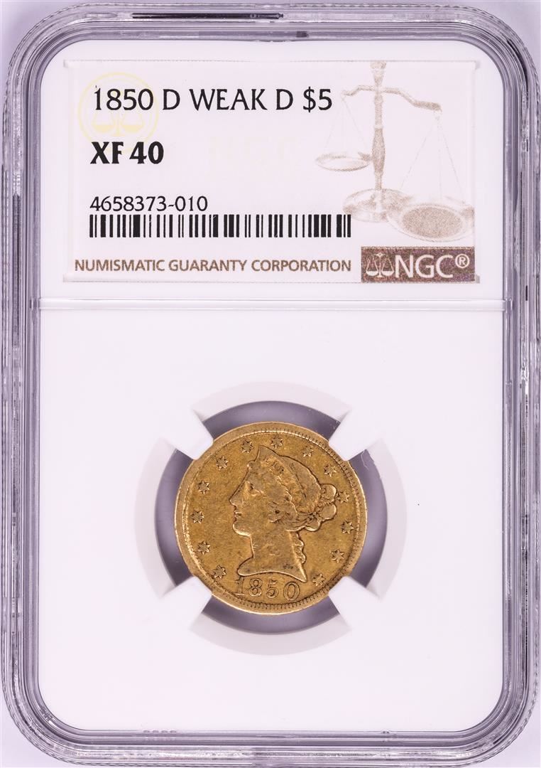One 1850-D Weak D $5 Liberty Head Half Eagle Gold Coin NGC XF40. NGC Certified.