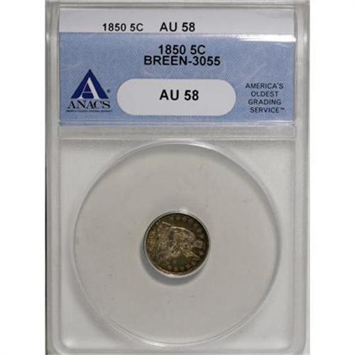 <B>1850 H10C AU58 ANACS.</B></I> Breen-3055. NGC Census: (13/169). PCGS Population (11/124). Mintage: 955,000. Numismedia Wsl. Price for NGC/PCGS coin in AU58: $120. (#4345)<BR><I>From The Al Blythe Collection of Half Dimes.</B></I><BR><BR><B>Coin Engraver:</B> Christian Gobrecht<BR><BR><b>Shipping:</b> Coins & Currency (<a target="_blank" href="http://www.heritageauctions.com/common/shipping.php">view shipping information</a>)