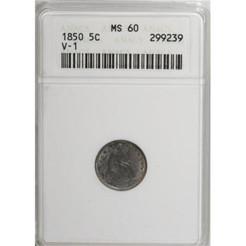 <B>1850 H10C MS60 ANACS.</B></I> V-1. PCGS Population (1/121). NGC Census: (1/169). Mintage: 955,000. Numismedia Wsl. Price for NGC/PCGS coin in MS60: $135. (#4345)<BR><BR><B>Coin Engraver:</B> Christian Gobrecht<BR><BR><b>Shipping:</b> Coins & Currency (<a target="_blank" href="http://www.heritageauctions.com/common/shipping.php">view shipping information</a>)