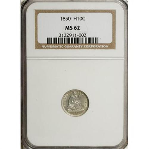 <B>1850 H10C MS62 NGC.</B></I> . NGC Census: (14/146). PCGS Population (19/99). Mintage: 955,000. Numismedia Wsl. Price for NGC/PCGS coin in MS62: $185. (#4345)<BR><BR><B>Coin Engraver:</B> Christian Gobrecht<BR><BR><b>Shipping:</b> Coins & Currency (<a target="_blank" href="http://www.heritageauctions.com/common/shipping.php">view shipping information</a>)
