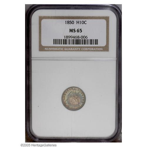 <B>1850<H10C> MS65 NGC.</B></I> Violet, gold, and sea-green coloration blankets each side in a variegated fashion. Well struck and blemish-free, with pleasing satin luster. A highly attractive Gem.
