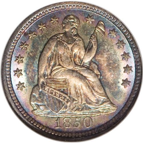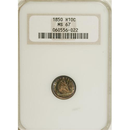 <B>1850 H10C MS67 NGC.</B></I> A rich coating of dappled patina covers each side of this satiny Superb Gem. Electric-blue, rose, and turquoise-green are among the most prominent colors on display. Except for the right side obverse stars, the design elements are all amazingly crisp and full. Careful inspection confirms the nearly pristine status of the obverse and reverse surfaces. Census: 7 in 67, 1 finer (4/07).<BR><BR><b>Shipping:</b> Coins & Currency (<a target="_blank" href="http://www.heritageauctions.com/common/shipping.php">view shipping information</a>)