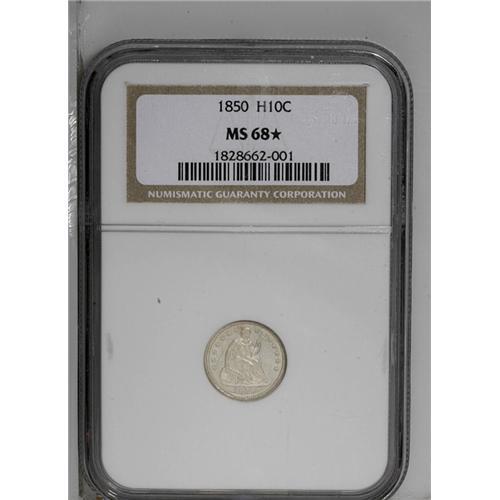 <B>1850<H10C> MS68 <img border='0' src='http://www.heritagecoins.com/images/star.gif' width=10 height=10> NGC.</B></I> Beginning in the earlier decades of the 19th century, silver and gold prices rose to levels that were higher than the intrinsic value of the bullion in the coins produced. As a result there was widespread melting of U.S. coins, culminating in extensive debate in Congress prior to passage of the Mint Act of 1853. This act reduced the amount of gold or silver in coins to levels that reduced the incentive to melt coins. This 1850 half dime was produced during this earlier period when it was still profitable to melt U.S. coins, and predictably such pieces are rarely encountered. Even so, a few hundred pieces have managed to survive in the various Uncirculated levels. According to the two major grading services, however, none can compare to the superlative example offered here. Its heavily striated surfaces are virtually untoned, giving the coin an essentially as-struck appearance. Memorable quality for this or any other Stars Obverse half dime. Census: 1 in 68 <img border='0' src='http://www.heritagecoins.com/images/star.gif' width=10 height=10>, 0 finer (6/06).