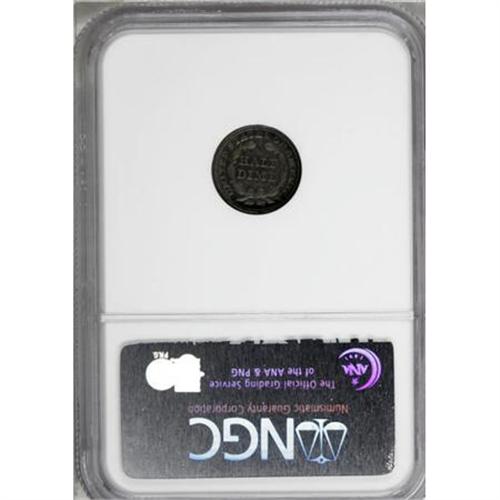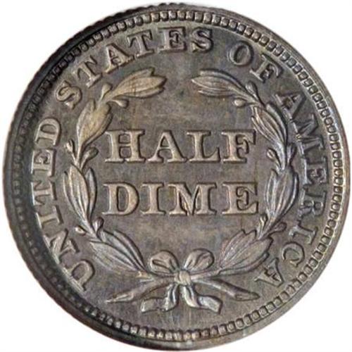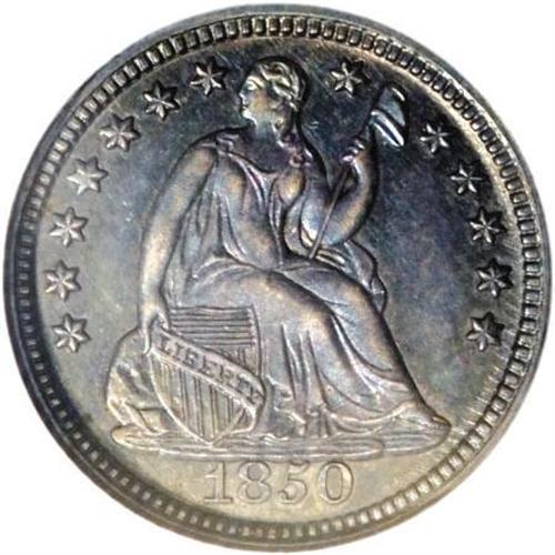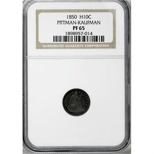 <B>1850 H10C PR65 NGC.</B></I> Ex: Pittman-Kaufman. The 1850 proof half dime, a wonderful Gem from the John Jay Pittman Collection, is an important rarity, one of only four or five known to exist.. Mintage estimates range from seven to ten pieces, but just three 1850 proof half dimes have been certified, all by NGC-a PR64, the Kaufman PR65, and one other PR65. <BR><B><BR> </B></I>Most known proof half dimes of the year are examples of Valentine-2, considered a proof-only variety by students of the series. On this variety, Valentine notes that the 18 and 5 touch the base of the rock under Liberty. Walter Breen was apparently the first to note that examples are only known as proofs, as discussed in his supplement to the Valentine reference, published in 1958 as a closing issue of Wayte Raymond's <I>The Coin Collector's Journal</B></I>.<BR><BR> The following roster is based on the auction appearances of 1850 proof half dimes known to us:<BR><BR><B>1. PR65 NGC.</B></I> <B>The Kaufman piece</B></I>. David Bullowa (5/1952); John Jay Pittman (David Akers, 10/1997), lot 484.<BR><BR><B>2. PR65.</B></I> Virgil Brand; New Netherlands Coin Co. (52nd Sale, 12/1958), lot 379; Goldberg Coins (2/2003), lot 303; Stack's (6/2004), lot 4194. The cataloger for New Netherlands notes the variety was unknown to Valentine, identified by the numerous parallel die scratches below and right of the date: "The only one we have seen from these dies, though about four or five other proofs are known from the dies of V-2."<BR><BR><B>3. Proof.</B></I> Will W. Neil (B. Max Mehl, 6/1947), lot 1628; Stack's (6/1998), lot 1148.<BR><B><BR>4. Proof. </B></I>Stack's (11/1995), lot 1162.<BR><BR> <B><I>Additional Appearances</B></I></B></I><B><BR>A. Proof.</B></I> Valentine plate. Only the obverse is plated in Valentine.<BR><B><BR>B. Proof.</B></I> Heman Ely (W. Elliot Woodward, 1/1884), lot 959; John Work Garrett; Johns Hopkins University (Stack's, 3/1976), lot 109.<BR><B><BR>C. Proof.</B></I> Golden I (Kreisberg Schulman, 2/1962), lot 910<BR><B><BR>D. Proof.</B></I> Numisma (7/1954)<BR><B><BR>E. Proof.</B></I> NN34: 463, impaired.<BR><BR> Extraordinary cobalt-blue, beige-gold, and violet toning graces each side of this impressive Gem, and a solid strike brings out the design elements, including complete separation between Liberty's foot and the sandal. The fields are well mirrored, and yield noticeable contrast with the motifs when the piece is tilted under a light source. Nicely preserved surfaces reveal a clash mark within the M of DIME, and numerous die polish lies are visible in the fields, along with a few unobtrusive hairlines. The only identifiers we can locate are a couple of tiny marks below the cap and another to the right of Liberty's neck. An extremely rare issue, examples of which do not frequently become available for sale.<BR><I>From The Phil Kaufman Collection of Early Seated Proof Sets, Part Two.</B></I><BR><BR><B>Coin Engraver:</B> Christian Gobrecht<BR><BR><b>Shipping:</b> Coins & Currency (<a target="_blank" href="http://www.heritageauctions.com/common/shipping.php">view shipping information</a>)