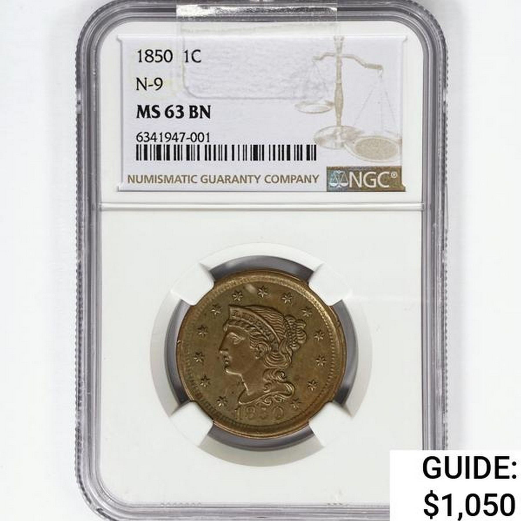 1850 Large Cent NGC MS63 BN, N-9