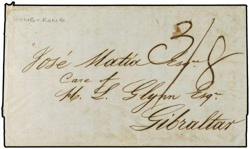 1850 (May 23) Large part entire letter (one complete sheet of two) from Hong Kong to Gibraltar with double rate unpaid of "3/8d". due on arrival (twice 1/10d.) with HONG KONG cds of despatch on reverse in black.