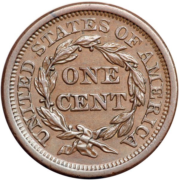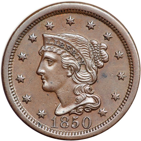 1850 N-11 R3 EF45. Frosty medium brown and light chocolate. Smooth and attractive. The only mark is a spot of darker toning in the field under the hair bun. Sharply struck E-MDS, die state a late. The spur down from the dentils left of star 4 is clear.