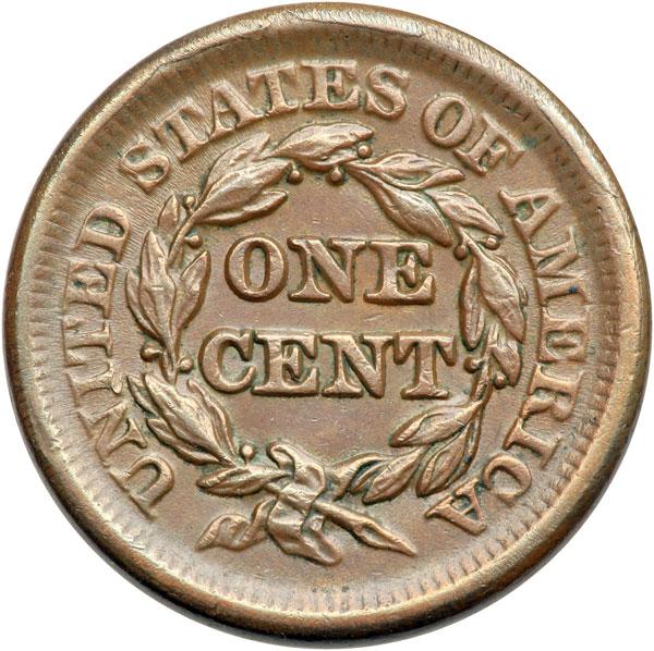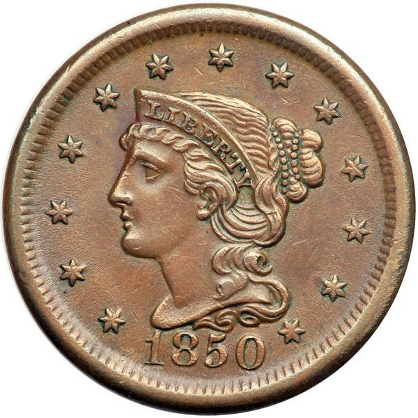 1850 N-14 R4 VF35. Ten points sharper with light abrasions on the reverse rim from K-6 clockwise to K-2. Otherwise the only defects are a couple very tiny rim nicks at stars 2 & 4. Glossy medium brown with slightly lighter brown toning on the highpoints and frosty flowline luster remaining in protected areas. Extremely rare late die state, die state g, with a series of 4 rim cud breaks at D-STATES and F-A. (The first cud occurs at D-ST, second at AT, next at F-A, and finally at ES.) CC#3 of only 4 known in this extremely rare intermediate die state. Noyes photo #30085. DWH #3239.