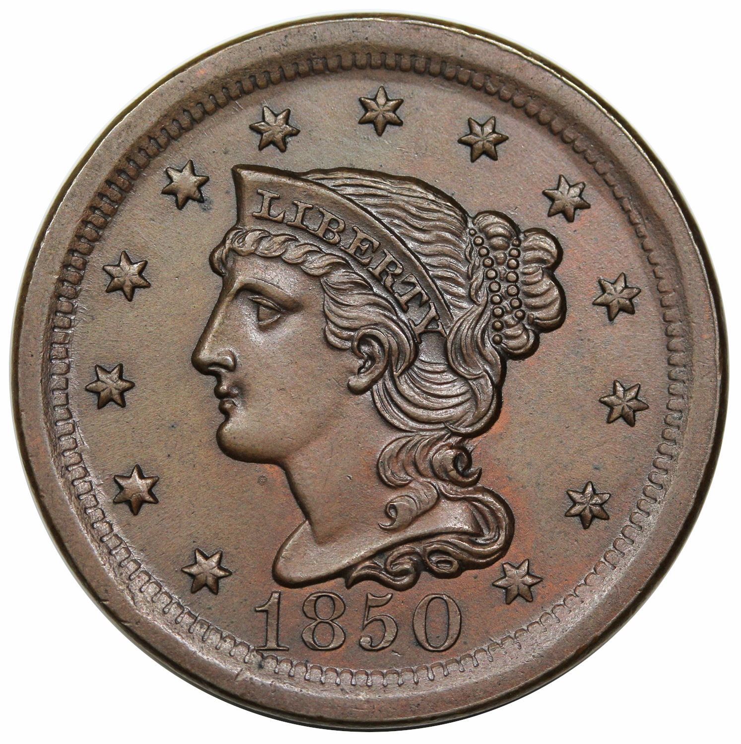 Essentially unworn but lightly cleaned and recolored to a nice chocolate brown with just a trace of orange. Obverse pristine in terms of marks, the reverse nearly so. Sharp EDS (a).
