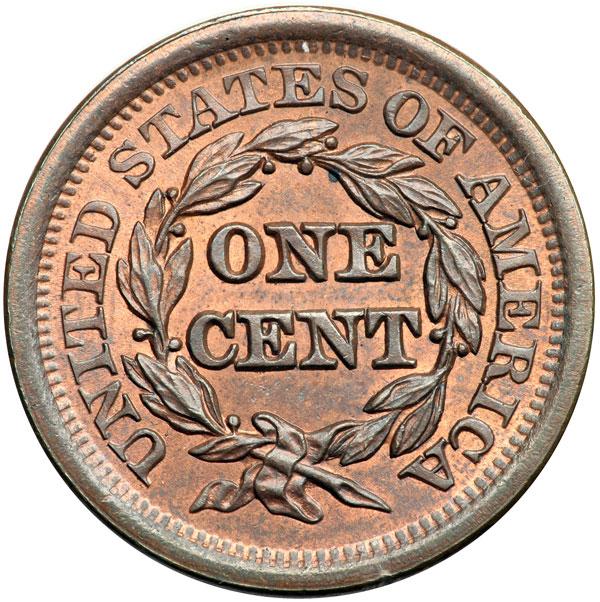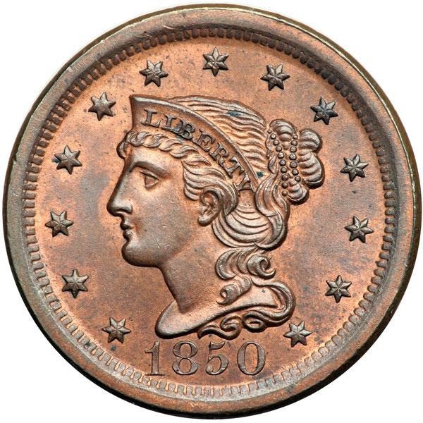 1850 N-15 R2 MS63. Slightly faded mint red mellowing to bluish steel brown, at least a third of the original red remaining, mostly on the reverse. There is a speck of carbon on the B in LIBERTY, a couple tiny nicks on the rim over star 6, and a very tiny rim nick under the stem tip. E-MDS, die state a. The parallel die lines over star 5 are sharp. Noyes photo #30112. DWH #1921.