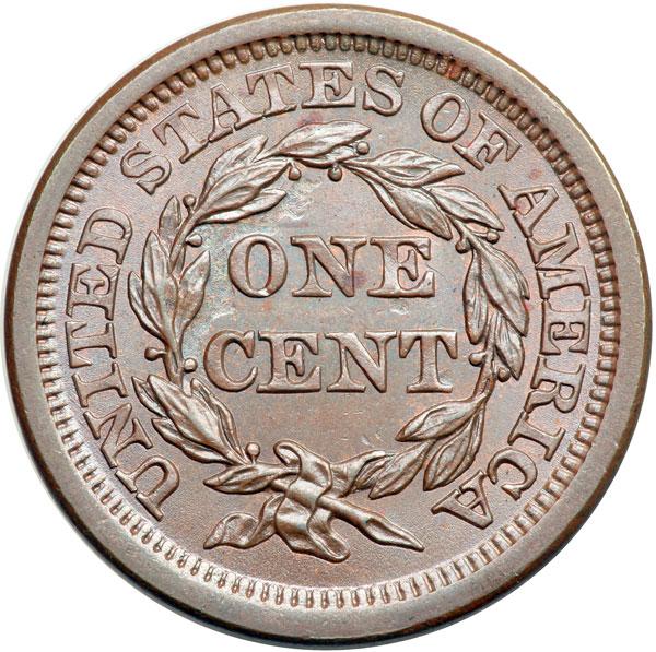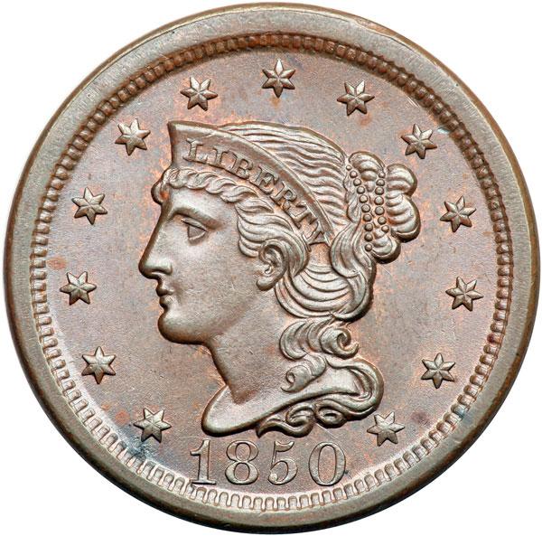 1850 N-17 R4+ MS62. Frosty light bluish steel brown with generous traces of faded mint red, mostly on the obverse. The surfaces are satiny and highly lustrous. Would rate a slightly higher grade except for a small patch of carbon dust at the dentils under star 1. MDS, die state b. Some of the obverse die lines are still visible and there is a die crack on the rim from star 6 to star 8 outlining where a cud is forming. A really interesting intermediate die state for this tough variety. CC#3 behind two marginally finer examples in the Grellman census, which includes only 5 mint state examples. Removed from a PCGS slab graded MS64BN (PCGS label included). DWH #2142.